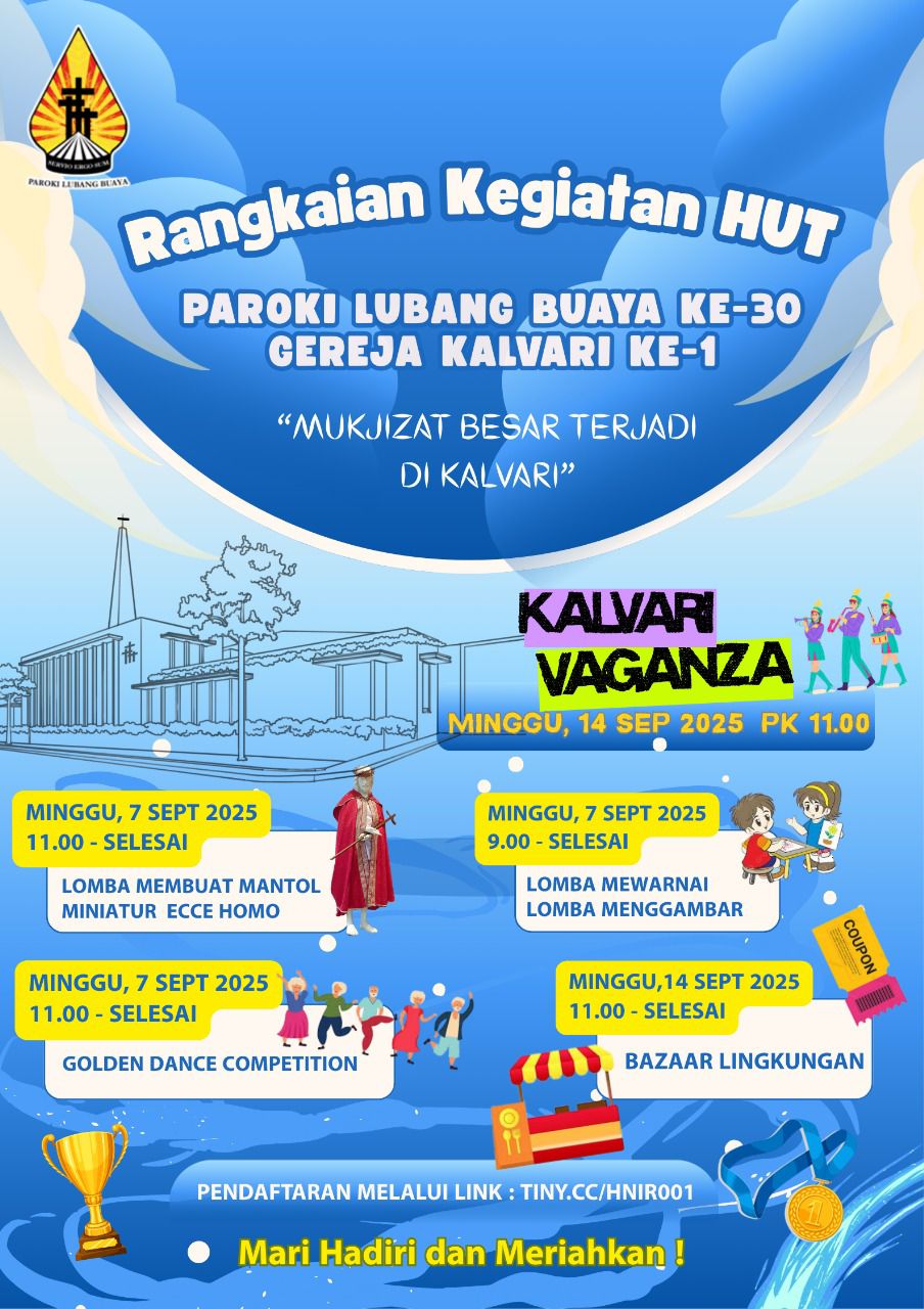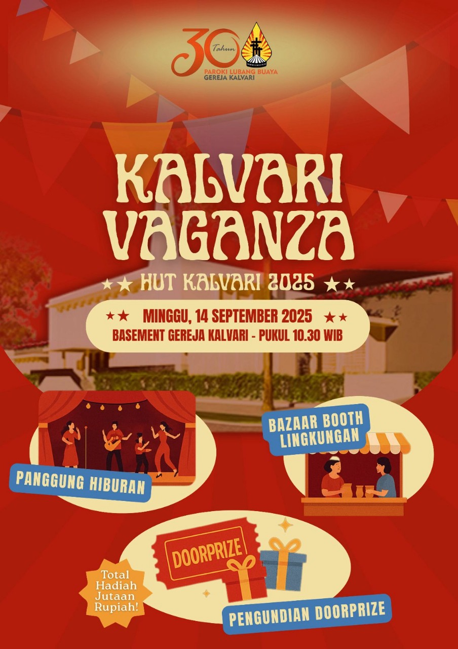 Dalam menutup rangkaian perayaan HUT Gereja Kalvari ke-1 dan HUT Paroki ke-30, panitia mengundang seluruh umat untuk hadir dalam Kalvari Vaganza yang akan diadakan pada Minggu, 14 September 2025, pukul 10.30 WIB di basement Gereja Kalvari. Acara ini akan dimeriahkan dengan panggung hiburan, bazaar, photobooth, serta pengundian doorprize dengan total hadiah jutaan rupiah.